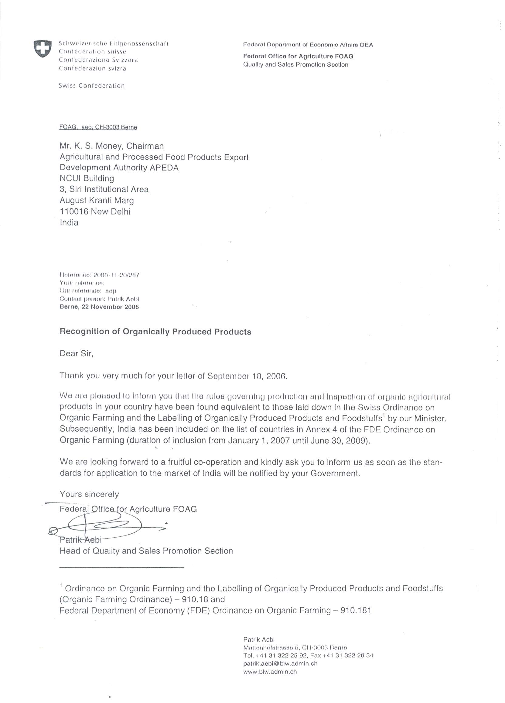 NPOP equivalence with Swiss Ordinance on Organic Farming